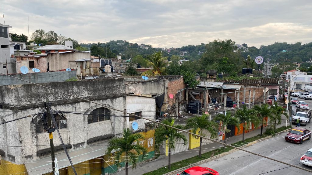 宿の部屋の窓から外を眺める。ここは標高もだいぶん低い場所に来たので南国の気候で椰子の木みたいな熱帯の植生が見られる。